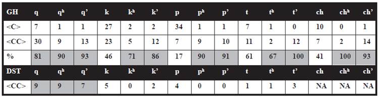 Aunque su ortografía es muy inconsistente, hay evidencia de que GH estaba intentando escribir tanto oclusivas complejas como consonantes uvulares con doble letras porque estas registran correspondencias más altas, mientras que para las oclusivas simples, menos /q/, las correspondencias son más bajas. Como el uso de duplicación de letras de DST es infrecuente, la muestra léxica no identificó suficientes ejemplos para análisis, entonces se consideró todos los casos de duplicación de consonantes en su obra en la tabla 11, donde vemos que hay algo de evidencia de que DST usaba letras dobles para representar /q/ (apoyando el análisis de Cerrón-Palomino de evidencia vocálica; 1990, pp. 364-369), pero esto no parece haber sido una estrategia para escribir oclusivas complejas (véase Cerrón-Palomino, 1990, pp. 345-346).
