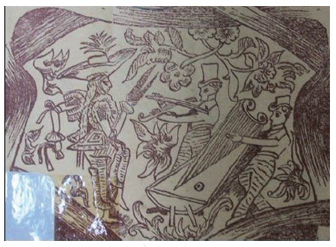 Bustamante Vernal tomó de modelo un “mate burilado de Ayacucho” del año 1848, para ilustrar la carátula del libro La agonía de Rasu Ñiti (Arguedas, 1962, p. 4). La tapa del libro es de color marrón claro y lleva una tipografía negra. Las letras están dispuestas en un renglón en el margen superior en letras mayúsculas con el nombre del autor “JOSÉ MARÍA ARGUEDAS”, y debajo el título del libro “LA AGONÍA DE ‘RASU ÑITI’”; en el tercer renglón está escrito el nombre de la editorial “camino del hombre” (véase imagen 3). La parte central de la carátula está conformada por una superficie rectangular de color marrón oscuro, que a su vez encierra a otra superficie rectangular, pero con sus cuatro esquinas redondeadas. En el interior están dibujados tres hombres, uno con sombrero, descalzo, de traje adornado de blondas, un pañuelo en la mano izquierda, y una tijera en la mano derecha; junto a otros dos hombres de sombrero en forma de copa, que tocan uno el arpa y el otro un violín rodeados de flores y hojas de una planta que decora la escena.