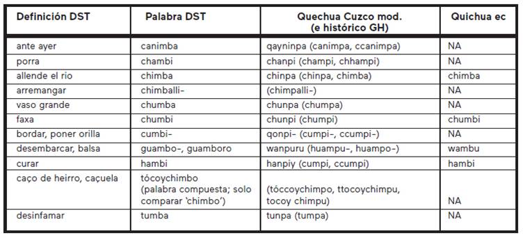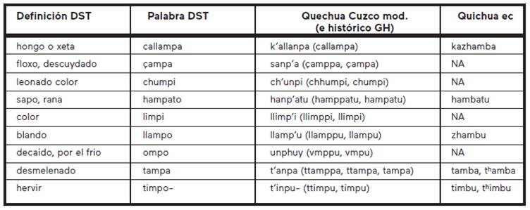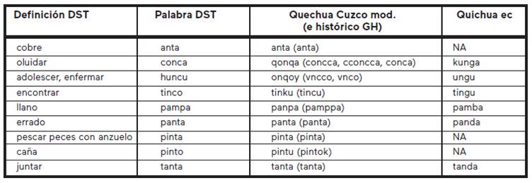 Tabla 6 Palabras con la secuencia <nt> en el quechua de DST y oclusivas complejas en el quechua cuzqueño (n = 7).