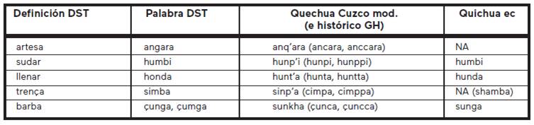 Tabla 2 Palabras con la secuencia <nc> en el quechua de DST y con oclusivas complejas en el quechua cuzqueño (n = 20).