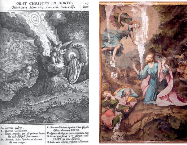 El grabado de Cristo ora en el huerto de Hieronymus Wierix, según Bernardino Passeri Romano, muestra una secuencia de escenas en una misma obra. Se puede notar que Cristo está de perfil y arrodillado, con las manos extendidas hacia los costados, mientras recibe el consuelo de un ángel, quien con la mano izquierda sostiene un cáliz y con la derecha señala hacia lo alto (Figura 9).