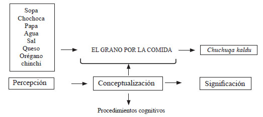 El proceso de nominación de platos típicos en el quechua ocurre en tres fases definidas. Es decir, en la lengua y la cultura del quechuahablante, resulta medular la consideración de una etapa de percepción, luego una de conceptualización y, finalmente, una de significación (la materialización lingüística). El estadio denominado conceptualización es el que direcciona el proceso de nominación a través de recursos metonímicos.