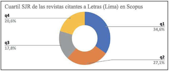 Otro aspecto importante es que la mayoría de citas hechas a la revista Letras (Lima) proviene de revistas académicas de alto impacto. Como se aprecia en la Figura 4, el 61,7% de citaciones resultan de revistas ubicadas en el primer o segundo cuartil. Para ello, es importante tomar en cuenta que Letras (Lima) todavía no figura en los cuartiles de Scopus, por su reciente ingreso. No obstante, ello no ha impedido que sea considerada por otros investigadores en revistas prestigiosas por la trayectoria académica que Letras (Lima) conlleva. Sin duda, esto también nos debe invitar a reflexionar sobre cómo se entiende hoy en día la calidad académica y la competencia entre las publicaciones periódicas. Este capitalismo académico agresivo en la producción científica debe ser atendido de forma crítica por toda la comunidad académica. En otras palabras, la calidad de las publicaciones en la revista Letras (Lima) no va de la mano con los cuartiles en los que se ubica. Sin embargo, paradójicamente, dichos cuartiles serán indicadores para identificar el alcance de la revista en el espacio académico global del siglo XXI.